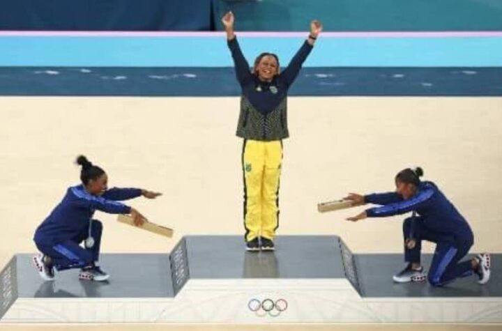 En un emocionante clímax en la prueba de piso de la gimnasia artística en las competencias parisinas, la brasileña Rebeca Andrade...